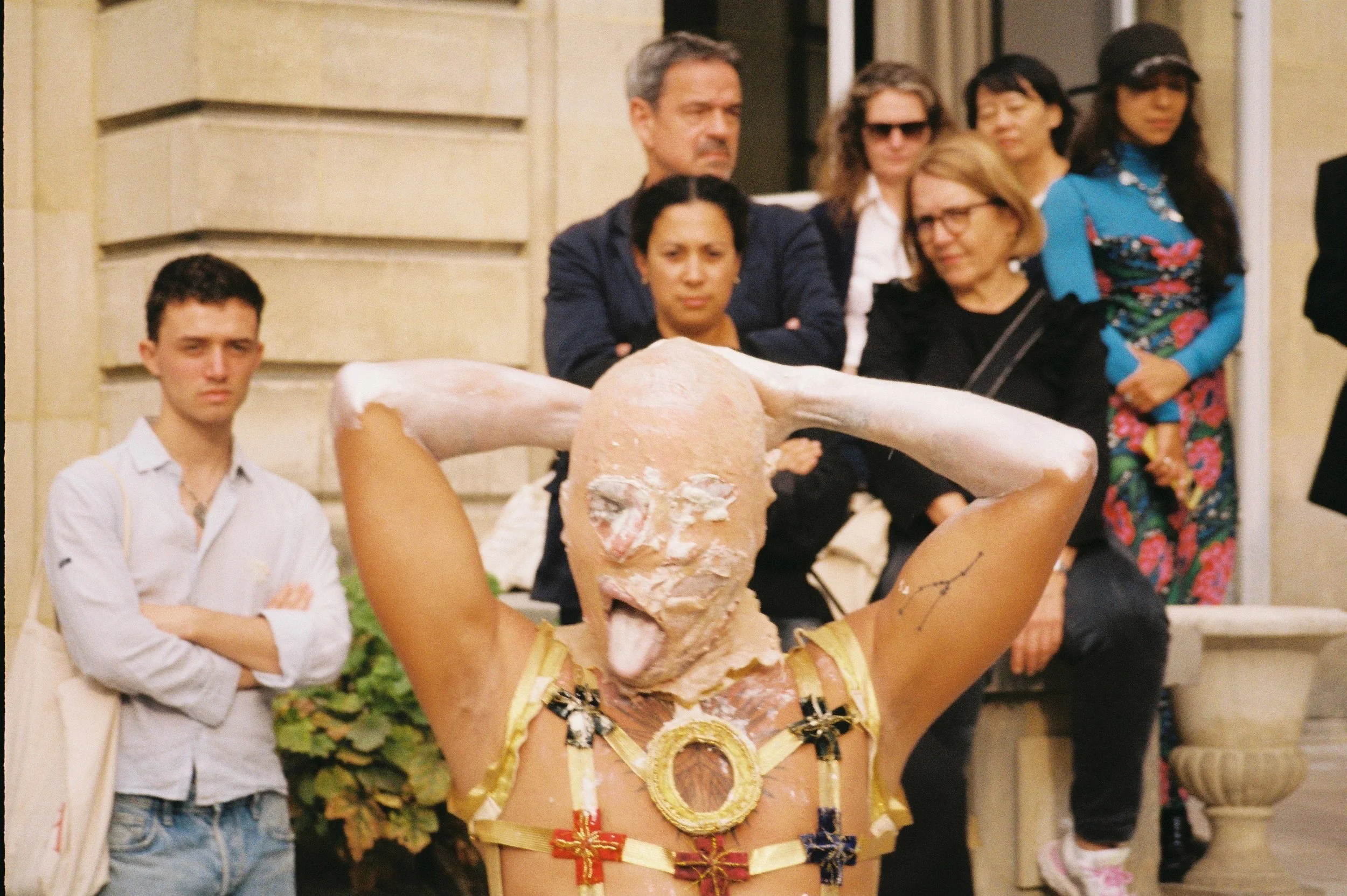 This piece explores the excess and absurdity of royal life in Europe during the Renaissance and the Baroque period, particularly the extravagance of Absolutism. In the garden of the Maison de l’Amérique Latine, I embody a hybrid character—part monarch, part jester—whose idiosyncrasies structure a one-man show combining theatrical imagery with melodramatic intensity. Inspired by Anne, Queen of Great Britain, and Louis XIV, the performance highlights the paradox between splendor and vulnerability, interrogating a past that continues to resonate today in persistent imbalances of wealth and power, reimagined through a hyper-queer, contemporary language.