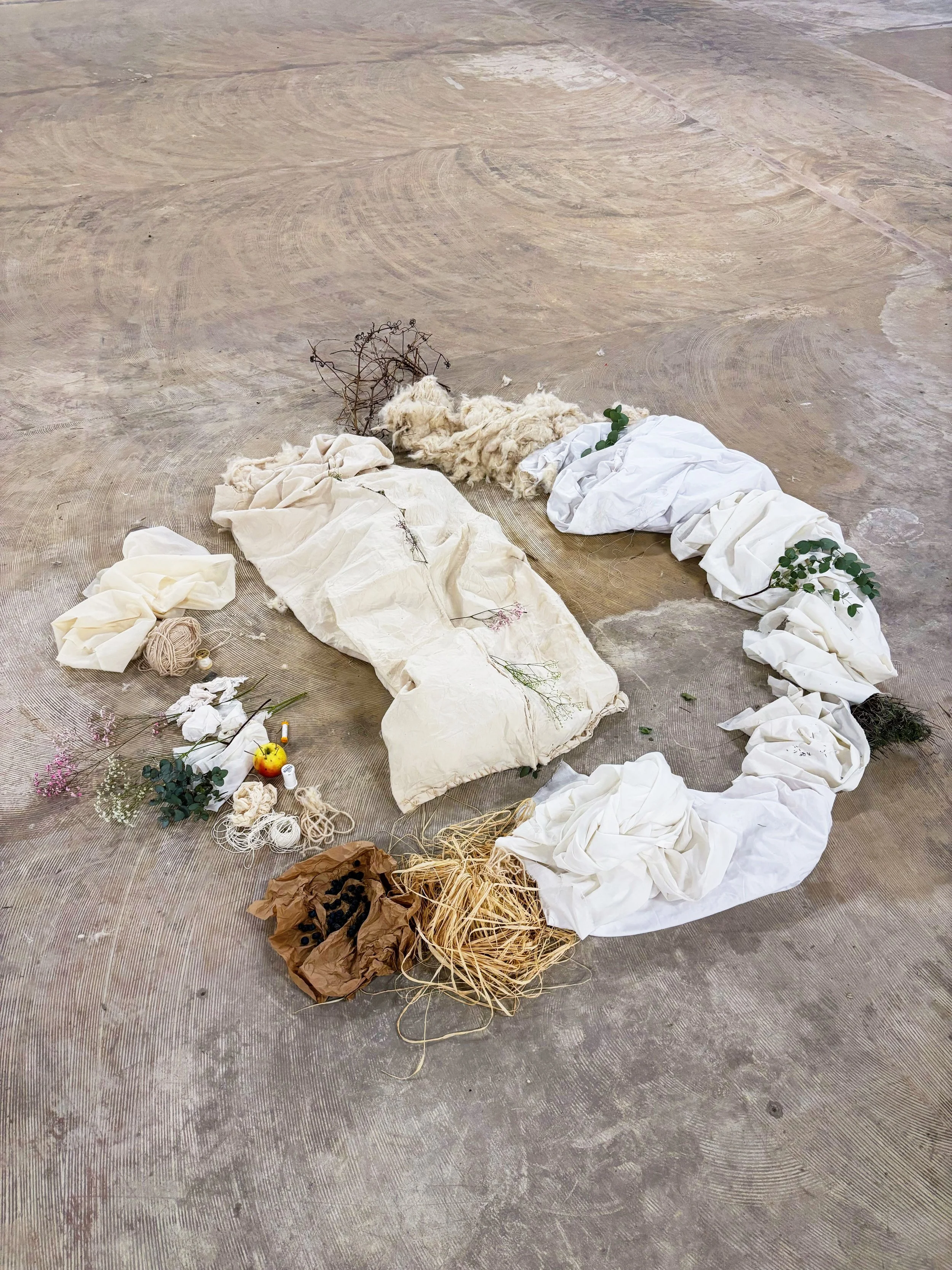 This eight-hour performance draws inspiration from the transgressive pupal stage insects undergo during metamorphosis, emphasizing endurance and the passage of time. Through repetitive gestures of sewing and binding fabrics around my body—forming an exoskeleton—I progressively enclosed myself in a cocoon-like structure, pausing at intervals to feed on blueberries and birch sap. I lined the enclosure with kapok and eucalyptus for warmth and comfort, then sealed it with yarn and baby’s-breath. These gestures articulate my long-durational practice and its movement toward a trance-like meditation.